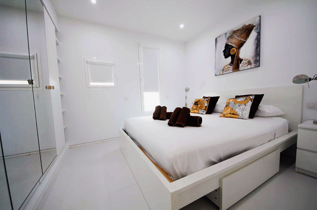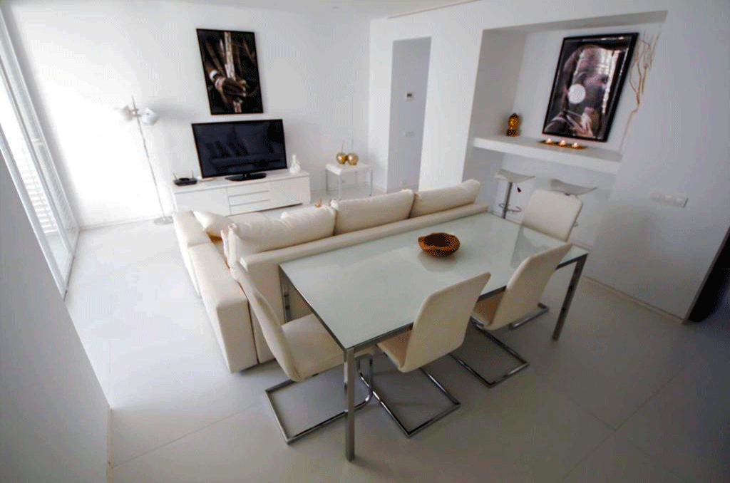 Patio Blanco’s excellent location – at Ibiza’s best entertainment area- not far from Marina Botafor is ideal for those who want to enjoy the numerous restaurants, bars and nightclubs of the popular yacht harbor district. The building is at walking distance from the scenic harbor strip -a real highlight- and from Ibiza’s Grand Hotel and it’s prestigious Spa. Hotel Pacha, Ibiza’s Casino, Cipriani Restaurant and some of the island’s legendary nightclubs, Heart, Lio and Pacha are also within reach. Patio Blanco is less than a 1 km away from both the Old City -a World Heritage Site- and Talamanca Beach and at a 9 km drive from Ibiza Airport.